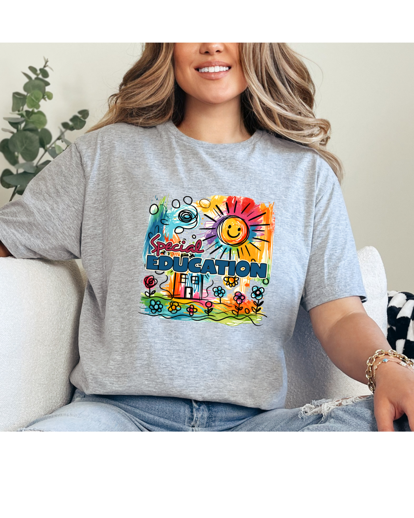 Show your support for special education with this vibrant and artistic t-shirt! Featuring a bold, hand-drawn design with a bright sun, flowers, and a welcoming schoolhouse, this tee celebrates the dedication of educators, parents, and advocates. Made from soft, high-quality fabric, it’s perfect for teachers, therapists, and anyone passionate about inclusion and learning.