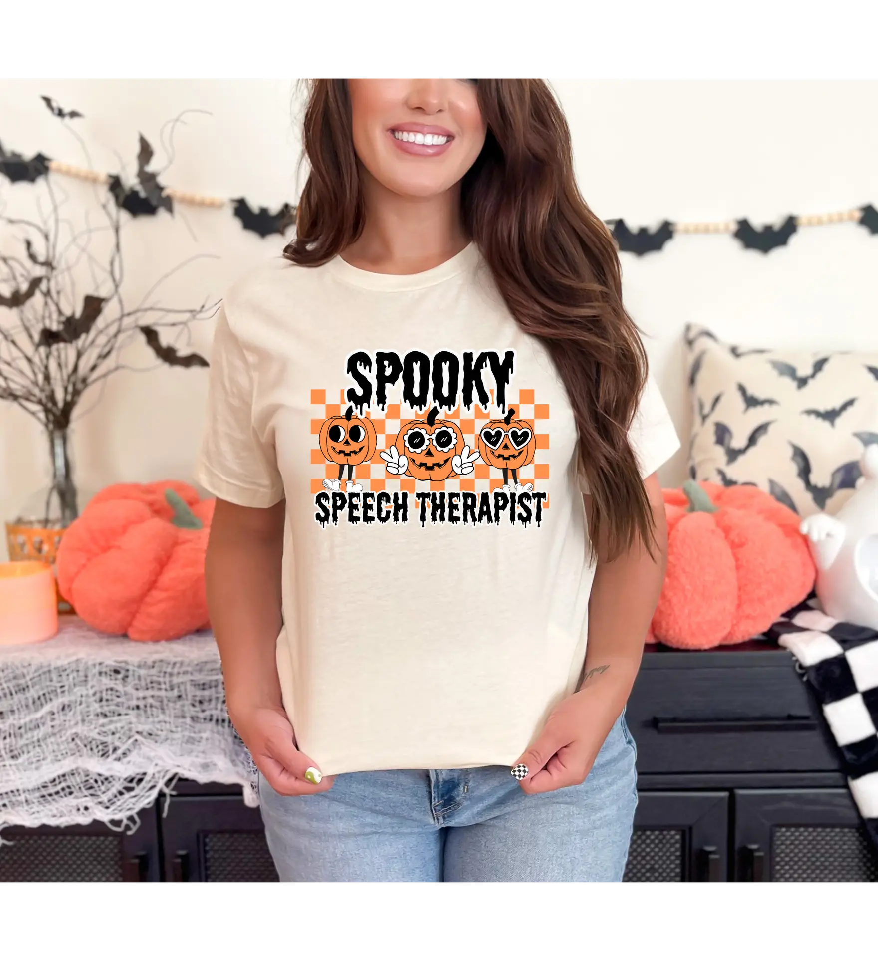 Celebrate the season with our Spooky Speech Therapist Halloween t‑shirt, designed to bring festive fun and professional pride into your classroom or clinic. Featuring three expressive jack‑o’‑lanterns set against a cheerful orange checkered background, this playful design is perfect for speech therapists who support diverse learners and promote inclusive communication.